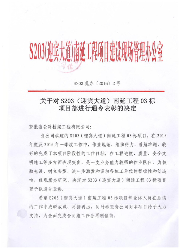 近日,由公司承建的S203(迎賓大道)南延工程03標(biāo)獲得業(yè)主發(fā)文通令表彰。