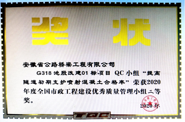 近日,從中國市政工程協(xié)會(huì)傳來喜訊,道路分公司G318池殷改建01標(biāo)QC小組申報(bào)的《提高隧道初期支護(hù)噴射混凝土合格率》課題,榮獲2020年度全國市政工程建設(shè)優(yōu)秀質(zhì)量管理小組二等獎(jiǎng)。此前,該項(xiàng)課題還榮獲了安徽省市政工程建設(shè)優(yōu)秀QC小組一等獎(jiǎng)、安徽省建設(shè)行業(yè)質(zhì)量與安全協(xié)會(huì)QC成果二等獎(jiǎng)、合肥市市政工程建設(shè)管理小組一等獎(jiǎng)等多項(xiàng)殊榮。