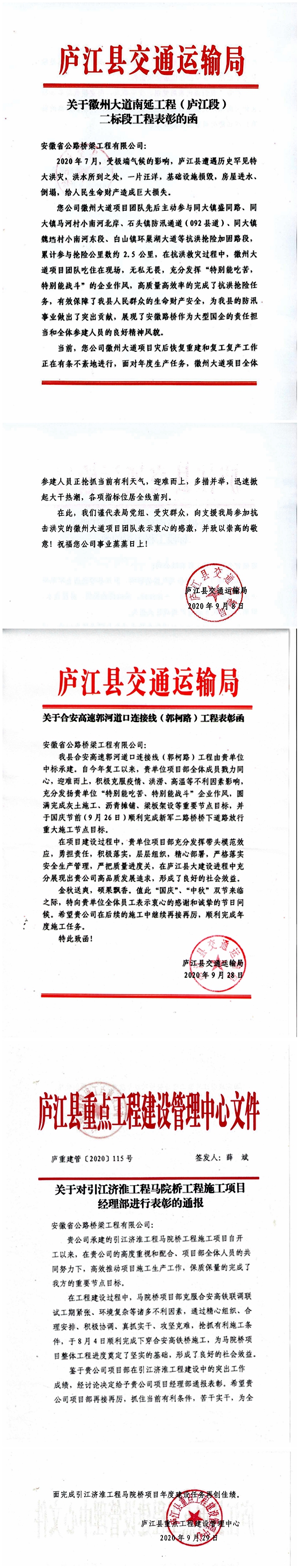 近日,廬江縣交通運(yùn)輸局、廬江縣重點(diǎn)工程建設(shè)管理中心先后發(fā)來表彰信,對公司承建的徽州大道南延工程(廬江段)二標(biāo)段、合安高速郭河道口連接線(郭柯路)工程、引江濟(jì)淮馬院橋工程項(xiàng)目戰(zhàn)疫情、抗洪水、搶進(jìn)度、樹形象,高標(biāo)準(zhǔn)、高質(zhì)量推進(jìn)施工生產(chǎn)給予表揚(yáng)和感謝。