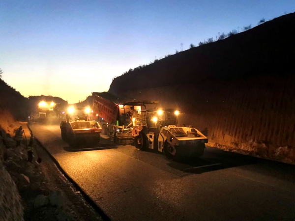 項(xiàng)目全長(zhǎng)34.6公里,途徑四個(gè)鄉(xiāng)鎮(zhèn),在完成路基施工后,根據(jù)交驗(yàn)時(shí)間分段進(jìn)入路面攤鋪。立足實(shí)際情況,項(xiàng)目充分發(fā)揮主觀能動(dòng)性,尋找一切可利用的工作面,精心策劃、見縫插針組織路面施工。在率先完成一工區(qū)水穩(wěn)、瀝青攤鋪施工任務(wù)后,迅速組織精干力量,轉(zhuǎn)戰(zhàn)一二工區(qū)連接部分?jǐn)備伿┕?,僅用20余天打通了兩個(gè)工區(qū)的運(yùn)輸通道。