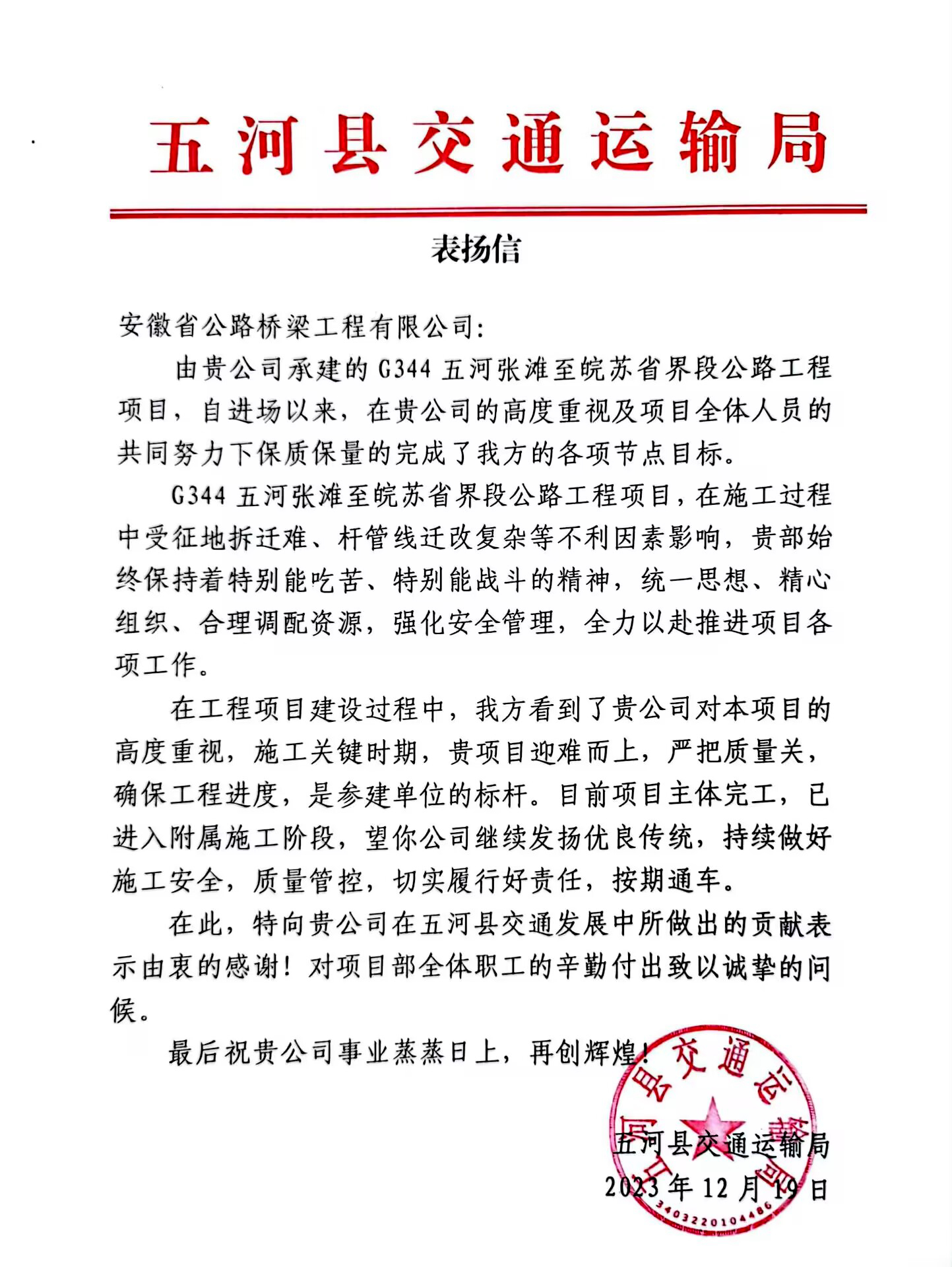 五河縣交通運輸局來信指出,G344五河張灘至皖蘇省界段公路工程自進場以來,項目全體參建人員統(tǒng)一思想、精心組織、合理調配資源,克服了征地拆遷難、桿管線遷改復雜等不利因素影響,保質保量地完成了各項節(jié)點目標,是全線參建單位的標桿。