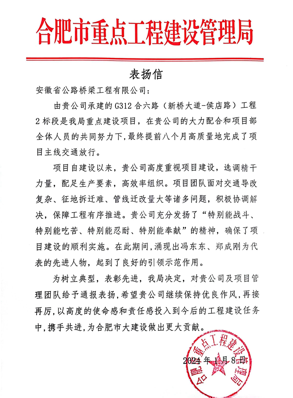 【載譽(yù)再出發(fā)】公司多個市政重點項目榮獲表彰(三) 發(fā)布時間:2024年01月09日 來源:市政分公司 發(fā)布人:黨委工作部 作者:周健 瀏覽:2779次 近日,公司承建的G312合六路(新橋大道-侯店路)工程2標(biāo)、金寨南路快速化改造(望水路-站前路)項目、金寨南路快速化改造工程(站前路—深圳路)1標(biāo)項目收到合肥市重點局來信表揚。 來信指出,G312合六路(新橋大道-侯店路)工程2標(biāo)等3個項目在建設(shè)過程中,高站位協(xié)調(diào),高標(biāo)準(zhǔn)組織,配齊選強(qiáng)項目管理團(tuán)隊,確保工程建設(shè)高效率、高質(zhì)量推進(jìn),圓滿完成了主線通車任務(wù)。同時對項目建設(shè)過程中涌現(xiàn)出的馮東東、鄧新龍、夏歡歡、鄭成剛、邵李、李小龍、王健等先進(jìn)人物進(jìn)行了表揚。