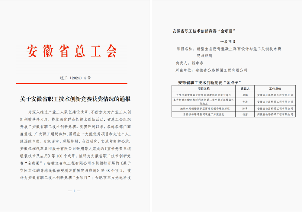 近日,安徽省總工會(huì)發(fā)布《關(guān)于安徽省職工技術(shù)創(chuàng)新競(jìng)賽獲獎(jiǎng)情況的通報(bào)》,公司報(bào)送的《新型生態(tài)瀝青混凝土路面設(shè)計(jì)與施工關(guān)鍵技術(shù)研究與應(yīng)用》獲評(píng)“金項(xiàng)目”,《大噸位牽索掛籃主桁架縱向滑移豎向提升施工》等4項(xiàng)建議獲評(píng)“金點(diǎn)子”。