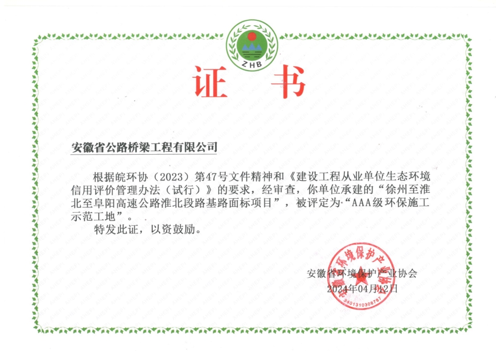 近日,安徽省環(huán)境保護(hù)產(chǎn)業(yè)協(xié)會公布了“2024年第2批建設(shè)工程從業(yè)單位生態(tài)環(huán)境信用評價結(jié)果”,由公司承建的徐州至淮北至阜陽高速公路淮北段路基路面標(biāo)、G329孫埠至大汪村段一級公路改建工程和合肥新橋國際機(jī)場綜合交通中心(含軌道引入)及配套工程施工總承包項目獲評安徽省“AAA級環(huán)保施工示范工地”稱號。