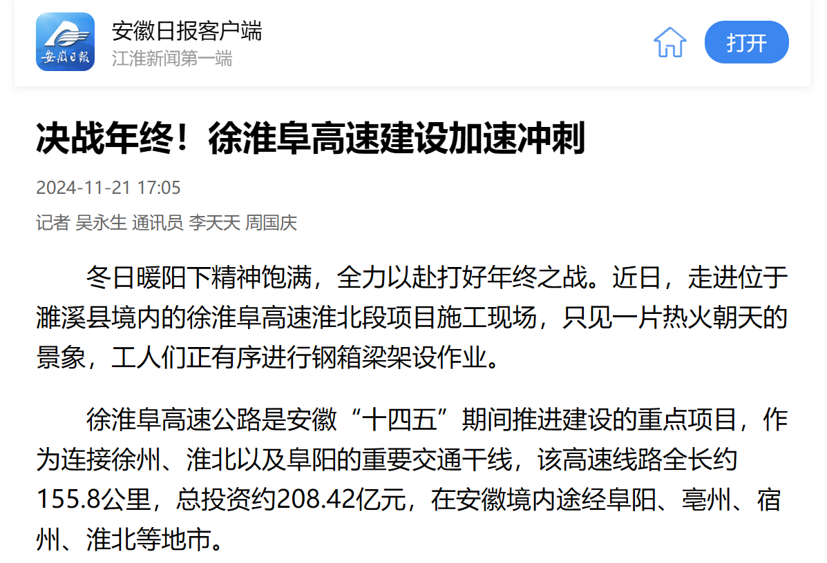 【名媒聚焦】安徽日?qǐng)?bào)客戶端、學(xué)習(xí)強(qiáng)國(guó)、淮北日?qǐng)?bào):決戰(zhàn)年終!徐淮阜高速建設(shè)加速?zèng)_刺
