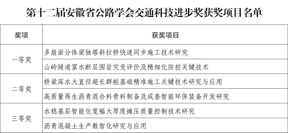 近日,安徽省公路學(xué)會八屆三次理事會在宣城召開,會上表彰了第十二屆安徽交通科技進步獎獲獎項目及2024年度先進單位。公司申報的6項科研項目成果分別榮獲一、二、三等獎,公司榮獲2024年度先進會員單位。