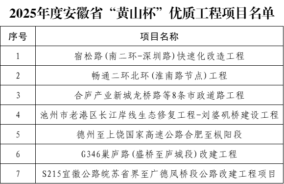 作為安徽省建設工程質量的最高榮譽獎項,“黃山杯”是全省工程建設領域質量標準的標桿,代表著行業(yè)頂尖水平與權威認可。此次獲獎的7個項目既有服務區(qū)域經(jīng)濟發(fā)展的交通大動脈,也有關乎民生福祉的市政基礎設施,不僅在工程質量、技術創(chuàng)新、綠色建造等方面表現(xiàn)突出,更在服務民生、推動區(qū)域發(fā)展中發(fā)揮了重要作用。