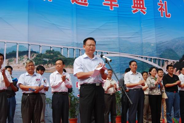 10時(shí)28分典禮正式舉行,來自兩岸的數(shù)千名群眾見證了這一激動(dòng)人心的時(shí)刻。省交通運(yùn)輸廳廳長梅勁、省公路局局長秦勤、省公路學(xué)會(huì)理事長李永鐸、六安市副市長楊光祥、金寨縣委書記沙洪虎、縣長夏倫平和四大班子成員、金寨縣各個(gè)鄉(xiāng)鎮(zhèn)主要負(fù)責(zé)人等領(lǐng)導(dǎo)出席了通車典禮。典禮由金寨縣委副書記、縣長夏倫平主持。來自我公司代表、金寨縣各單位代表共同組織了八個(gè)方陣參加了典禮。公司總經(jīng)理汪衛(wèi)東應(yīng)邀出席典禮,并參加了剪彩儀式。