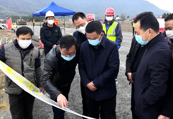 3月1日下午,安徽省交通運輸廳總工程師章后忠一行到公司承建的涇縣208省道延伸段調(diào)研防疫和復(fù)工工作,涇縣副縣長程禮奎、交通運輸局局長曹建華等陪同。