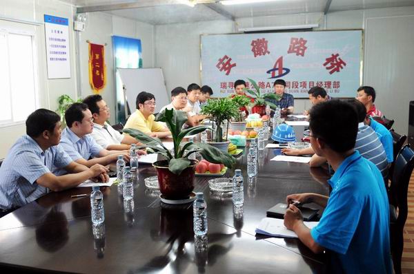 在項目部會議室,投資集團劉總在聽取項目經(jīng)理劉大雷的工作匯報后,實地察看了項目施工現(xiàn)場及站塘大橋拌合站運行情況,對項目部在近期取得成績給予肯定,并祝賀安徽路橋在五月份的評比中取得第一名。