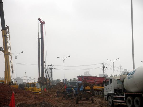 目前,項目部已具備辦公條件,主要管理人員已基本到位,道排、橋梁、樁基、擋墻等施工隊伍已進場施工,并于7月5日,完成首根樁基的澆筑。項目部在人員不足,桿管線、污水燃氣管道錯綜復雜等不利因素的影響下,利用現(xiàn)有條件充分挖掘工作面。截止7月17日,已完成駐地建設,懷寧路下穿橋支護咬合樁33根、下穿橋樁基28根,翡翠路上跨橋鉆孔樁22根,棄土方14600方、溝槽開挖2840方,回填2180方,雨污水管道埋設約730米,累計完成產(chǎn)值約1000萬元。