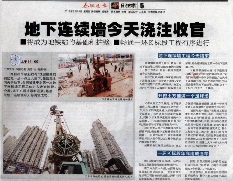 合肥晚報重點報道一環(huán)K標地下連續(xù)墻施工