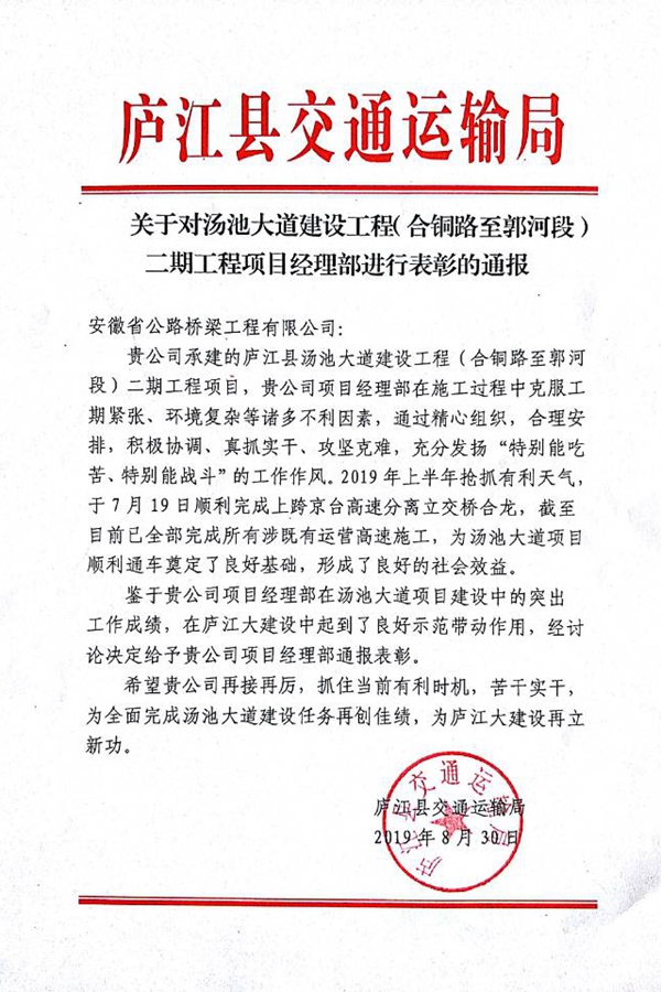 近日,廬江縣交通運輸局發(fā)文對湯池大道二期項目進(jìn)行通報表彰,高度肯定了項目團(tuán)隊管理水平及工程形象進(jìn)度等工作。