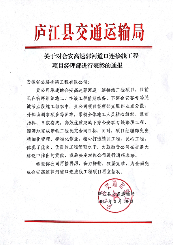 近期,廬江縣交通運(yùn)輸局對郭柯路項(xiàng)目圓滿完成涉鐵工程既定合同目標(biāo)進(jìn)行了通報(bào)表彰。