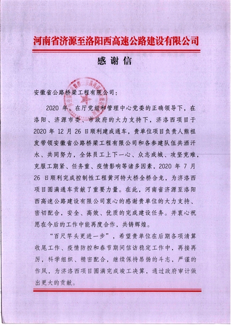 黃河特大橋項(xiàng)目收到業(yè)主來(lái)信感謝