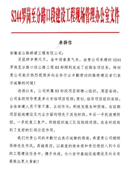 近日,六安市S244羅崗至分路口段建設工程現場辦發(fā)來表揚信,對公司承建的03標項目順利完成前期各項任務給予高度認可并通報表揚。