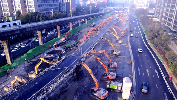 2020年12月4日22時,項目封閉施工,正式吹響大干的號角。26天后,首根墩柱順利澆筑。2月3日,30臺大型破碎機組成“鋼鐵戰(zhàn)隊”,僅用15個小時便完成了原計劃兩天才能完成的匝道拆除任務(wù)。3月25日,經(jīng)過35天的持續(xù)奮戰(zhàn),主線橋第四聯(lián)順利架設(shè),提前拉開了上部結(jié)構(gòu)施工的序幕。
