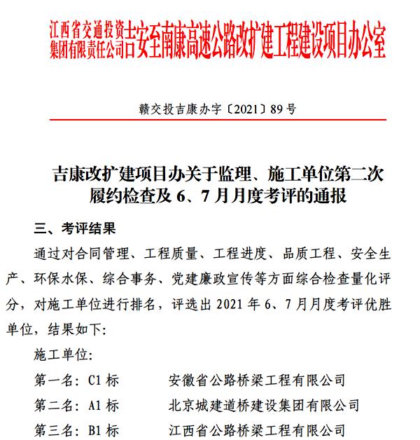 8月8日,吉康改擴(kuò)建項(xiàng)目辦公布了2021年6、7 月考評(píng)結(jié)果,公司承建的吉康改擴(kuò)建C1標(biāo)連續(xù)兩個(gè)月獲月度綜合考核第一名。