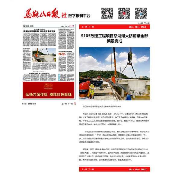 近日,公司承建的馬鞍山市S105改建工程項目慈湖河大橋箱梁全部架設完成,得到了馬鞍山電視臺、馬鞍山日報等當地主流媒體的重點關注。