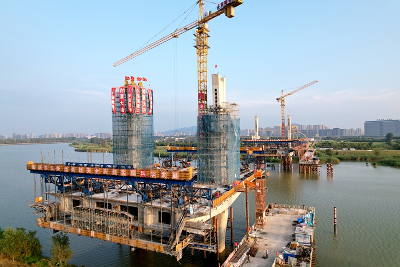 G206-03標渦河八橋主塔全部封頂 發(fā)布時間:2023年09月11日 來源:橋梁分公司 發(fā)布人:黨委工作部 作者:朱柏文 瀏覽:3669次 9月9日,G206-03標項目渦河八橋北岸14#墩左幅主塔順利封頂。至此,大橋南北兩岸4個主塔全部封頂,標志著該項目主橋施工再次取得突破性進展,為后續(xù)的主梁懸澆和斜拉索掛設施工打下了堅實基礎。