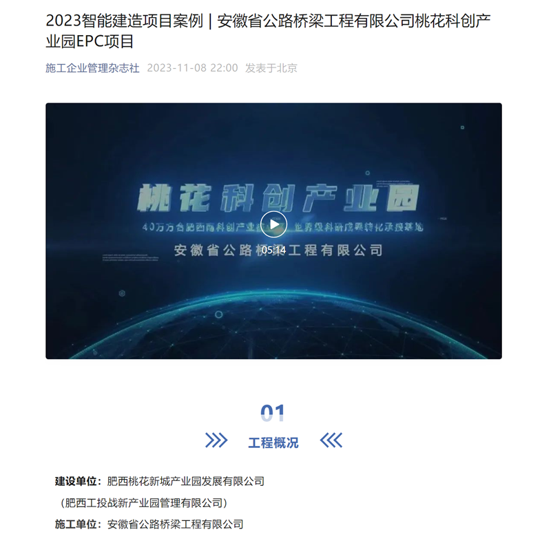 近日,從施工企業(yè)管理雜志社傳來喜訊,桃花科創(chuàng)產(chǎn)業(yè)園項(xiàng)目入選施工企業(yè)管理雜志社2023智能建造項(xiàng)目案例,同步對案例進(jìn)行了專題介紹。