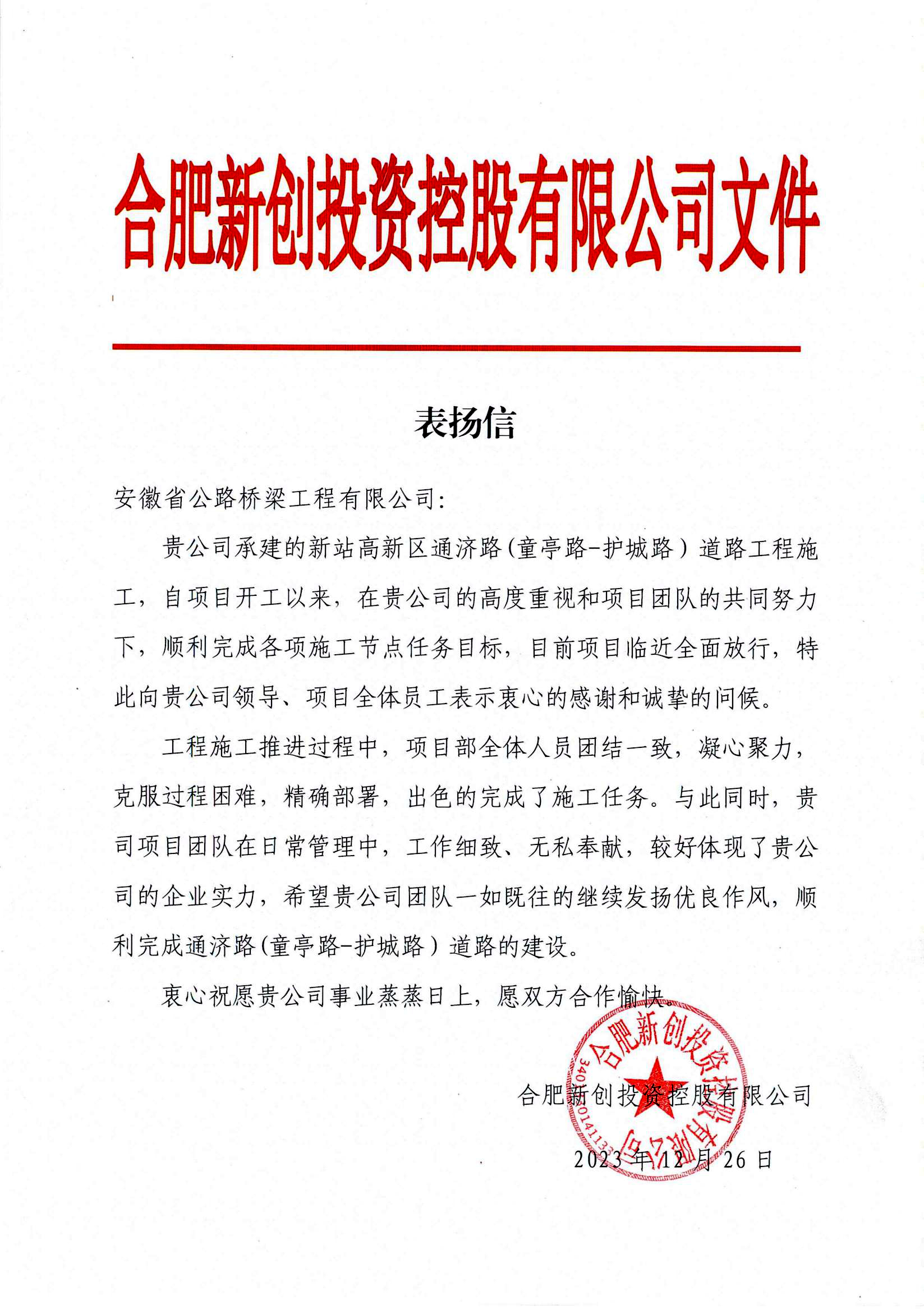 合肥新創(chuàng)投資控股有限公司來信表示,新站高新區(qū)通濟路(童亭路-護城路)道路工程施工推進過程中,項目團隊發(fā)揚路橋鐵軍優(yōu)良作風,咬定目標攻堅克難,持續(xù)加強現(xiàn)場安全文明施工和質量管理,圓滿完成各項施工任務,彰顯了國企腳踏實地、久久為功的擔當作風。