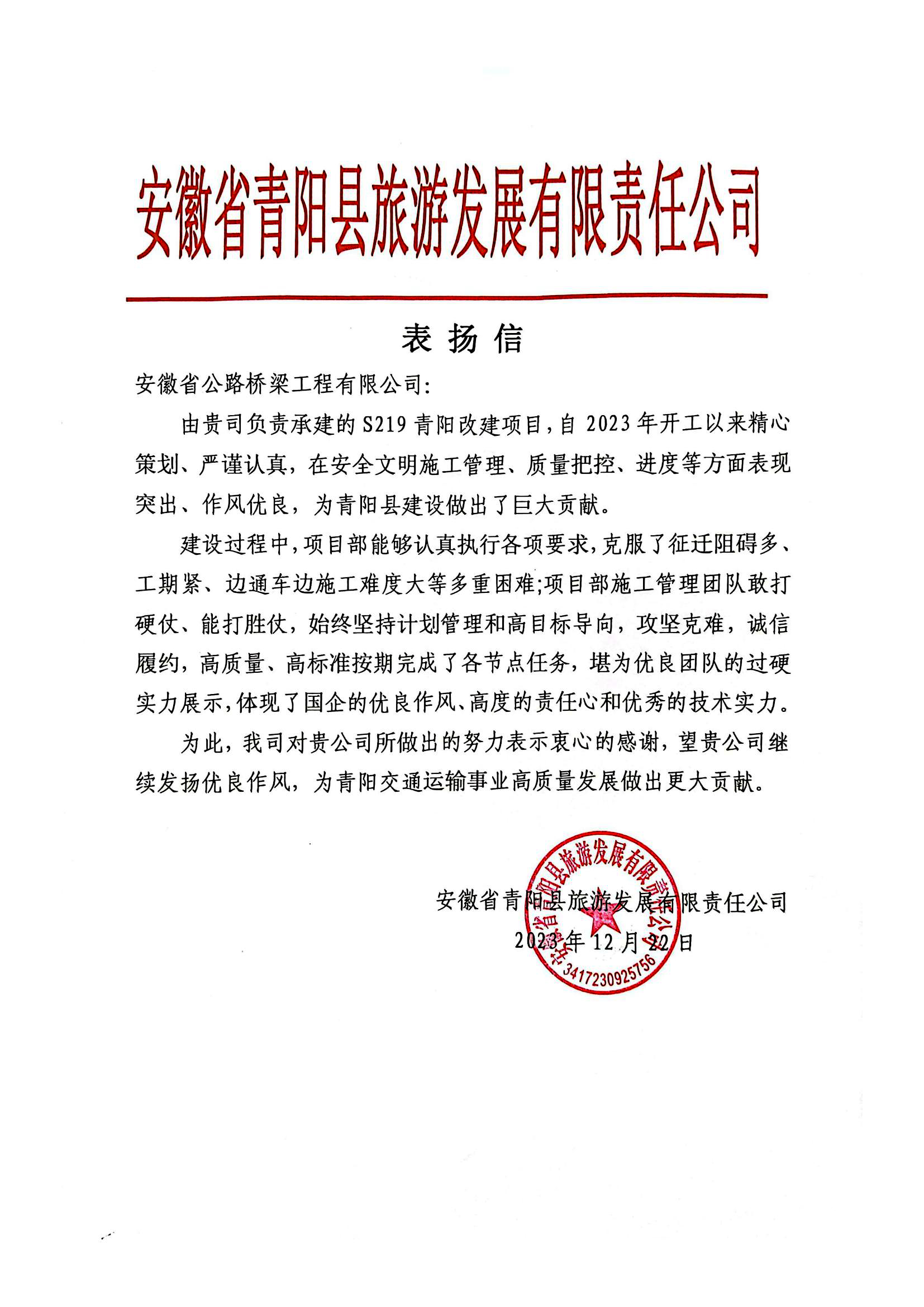 安徽省青陽縣交通運輸局和青陽縣旅游發(fā)展有限公司來信指出,S219青陽蛤蟆嶺至青通河大堤段公路改建工程項目建設過程中,項目施工管理團隊克服了汛期影響大、工期緊、邊通車邊施工難度大等諸多困難,高質量、高標準按期完成了各節(jié)點任務,為青陽交通運輸事業(yè)高質量發(fā)展做出了巨大貢獻。