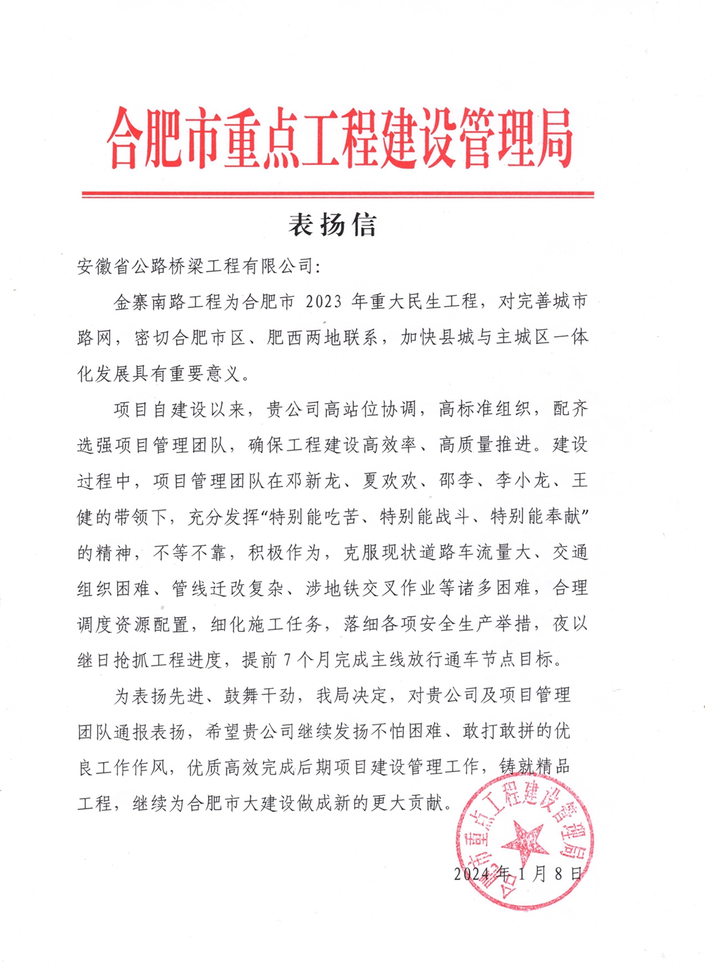 【載譽(yù)再出發(fā)】公司多個市政重點項目榮獲表彰(三) 發(fā)布時間:2024年01月09日 來源:市政分公司 發(fā)布人:黨委工作部 作者:周健 瀏覽:2779次 近日,公司承建的G312合六路(新橋大道-侯店路)工程2標(biāo)、金寨南路快速化改造(望水路-站前路)項目、金寨南路快速化改造工程(站前路—深圳路)1標(biāo)項目收到合肥市重點局來信表揚。 來信指出,G312合六路(新橋大道-侯店路)工程2標(biāo)等3個項目在建設(shè)過程中,高站位協(xié)調(diào),高標(biāo)準(zhǔn)組織,配齊選強(qiáng)項目管理團(tuán)隊,確保工程建設(shè)高效率、高質(zhì)量推進(jìn),圓滿完成了主線通車任務(wù)。同時對項目建設(shè)過程中涌現(xiàn)出的馮東東、鄧新龍、夏歡歡、鄭成剛、邵李、李小龍、王健等先進(jìn)人物進(jìn)行了表揚。