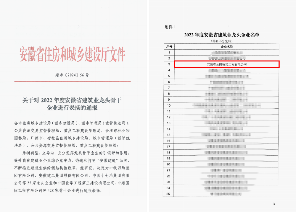 近日,安徽省住房和城鄉(xiāng)建設(shè)廳發(fā)文,對(duì)安徽路橋等25家2022年度安徽省建筑業(yè)龍頭企業(yè)和428家骨干企業(yè)進(jìn)行了通報(bào)表?yè)P(yáng)。