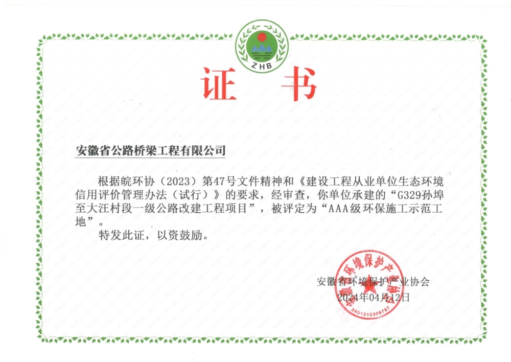 近日,安徽省環(huán)境保護(hù)產(chǎn)業(yè)協(xié)會公布了“2024年第2批建設(shè)工程從業(yè)單位生態(tài)環(huán)境信用評價結(jié)果”,由公司承建的徐州至淮北至阜陽高速公路淮北段路基路面標(biāo)、G329孫埠至大汪村段一級公路改建工程和合肥新橋國際機(jī)場綜合交通中心(含軌道引入)及配套工程施工總承包項目獲評安徽省“AAA級環(huán)保施工示范工地”稱號。