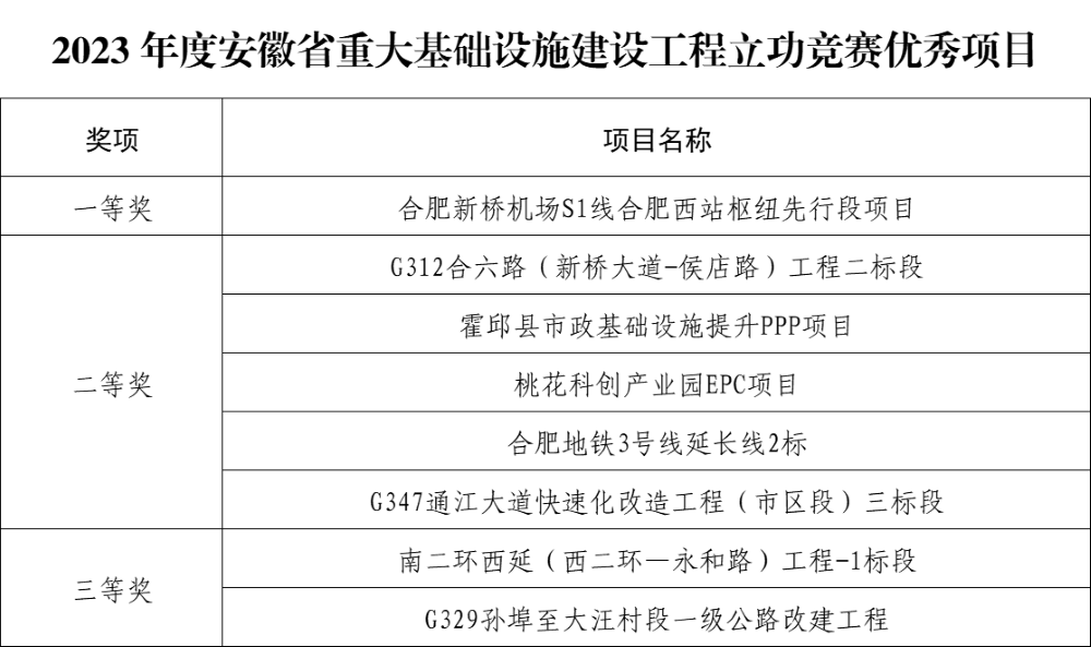近日,安徽省住房和城鄉(xiāng)建設廳與安徽省總工會對2023年度以“六比六賽”為主要內容的安徽省重大基礎設施建設工程立功競賽參賽項目進行了通報表揚,公司多個項目獲得優(yōu)秀項目稱號。其中合肥新橋機場S1線先行段項目獲一等獎;G312合六路2標等5個項目獲二等獎;G329改建工程項目等2個項目獲三等獎。