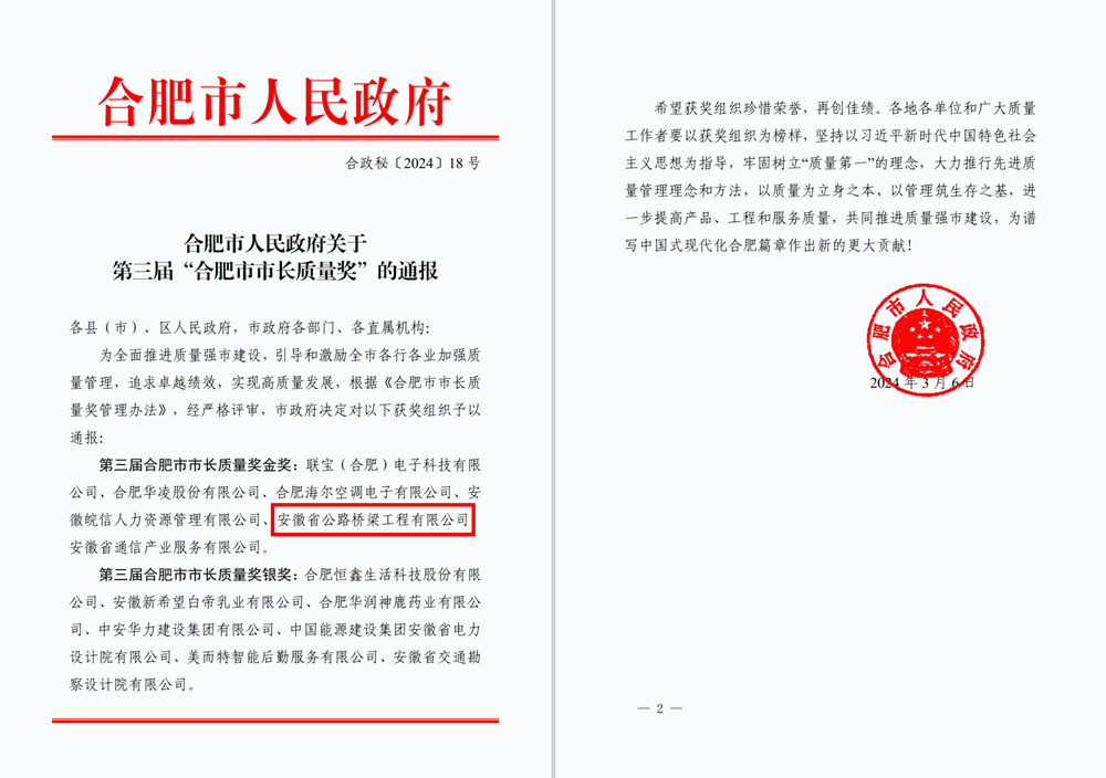 近日,合肥市人民政府公布了第三屆“合肥市市長質(zhì)量獎”名單,安徽路橋獲評金獎。