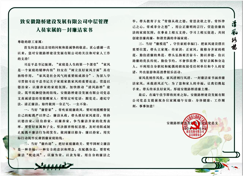 建設公司深入貫徹落實集團紀委陽光、清廉、建工“六個一”廉潔文化創(chuàng)建工作部署,積極推進“清廉”之家建設。組織開展“5·10思廉日”活動,為50余名管理人員發(fā)放廉潔家書,進一步加強家風家教建設,將家庭親情融入職工廉潔教育中;組織參與公司紀委讀書月讀廉書活動,擇優(yōu)推薦3幅讀廉書作品。組織職工積極參加公司信息化“廉潔知識測試”活動,促進黨員干部職工以考促學、以學促廉。