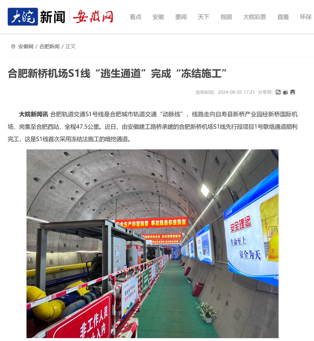 【名媒聚焦】央廣網(wǎng)、中安在線(xiàn)、大皖新聞:“凍”出來(lái)的“生命通道”——合肥新橋機(jī)場(chǎng)S1線(xiàn)凍結(jié)法施工聯(lián)絡(luò)通道順利完工