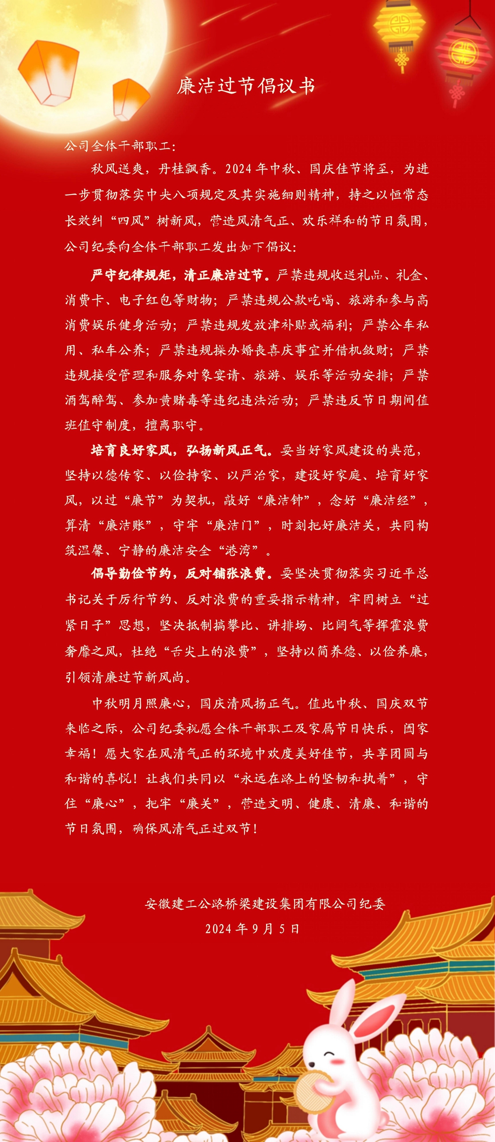清風(fēng)路橋 | 廉潔過節(jié)倡議書 發(fā)布時(shí)間:2024年09月05日 來源:紀(jì)委紀(jì)檢室 發(fā)布人:黨委組織部(人力資源部、黨委宣傳部) 作者: 瀏覽:1889次