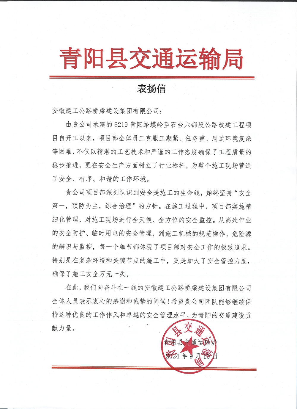 青陽縣交通運(yùn)輸局來信表示,青陽S219改建項(xiàng)目自開工以來,不斷克服工期緊、任務(wù)重、周邊環(huán)境復(fù)雜等困難,始終堅持“安全第一,預(yù)防為主,綜合治理”的方針,安全穩(wěn)步推動項(xiàng)目建設(shè),在安全生產(chǎn)方面樹立了標(biāo)桿。