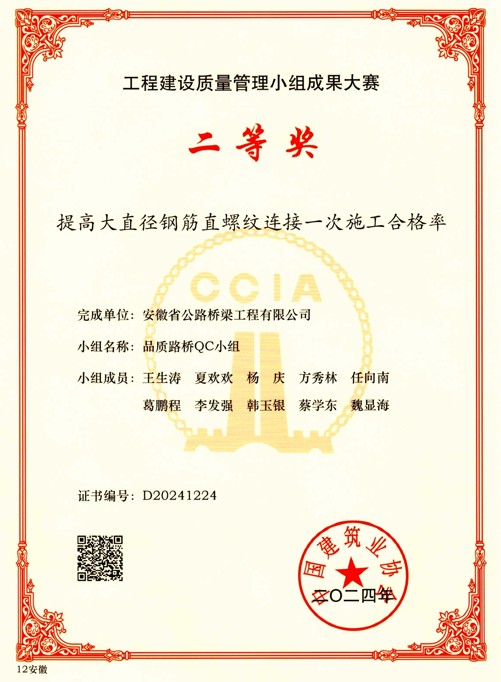 本次QC決賽共發(fā)布751項(xiàng)成果。公司推薦的《提高索導(dǎo)管定位安裝一次性驗(yàn)收合格率》《提高現(xiàn)澆箱梁波紋管準(zhǔn)確安裝一次性驗(yàn)收合格率》2項(xiàng)QC成果獲一等獎(jiǎng),《提高大直徑鋼筋直螺紋連接一次施工合格率》QC成果獲得二等獎(jiǎng)。
