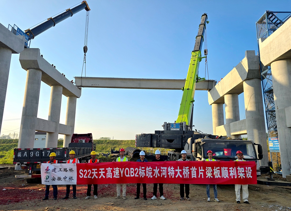 在S22天天高速YQB2標(biāo)關(guān)鍵控制性工程——皖水河特大橋施工現(xiàn)場,項目部緊盯施工節(jié)點,壓實責(zé)任抓落實,順利完成首片預(yù)制箱梁架設(shè)。