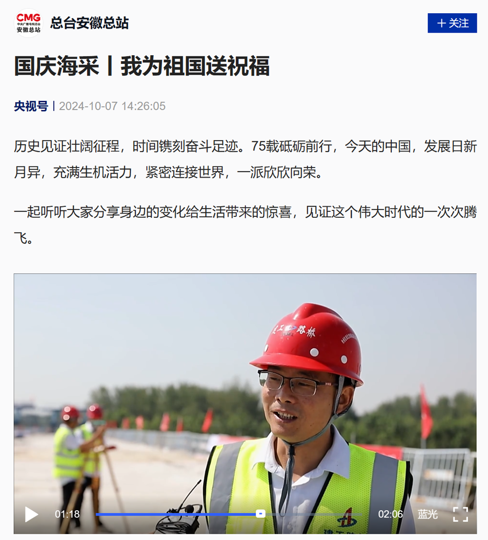 10月7日,中央廣播電視總臺CCTV4-中文國際頻道《中國新聞》欄目、央視新聞、央視頻客戶端對公司承建的徐淮阜高速淮北段項目國慶假期“不打烊”推進工程建設(shè)情況進行了報道。