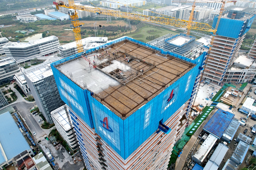 自二期建設(shè)以來(lái),項(xiàng)目集中優(yōu)勢(shì)資源高效推進(jìn)主體結(jié)構(gòu)施工。此次完成封頂?shù)腁4#樓單體,建筑面積約37000平方米,地上建筑22層,建筑高度95.3米。建成后將成為集高端企業(yè)總部、星級(jí)酒店、辦公樓、商業(yè)會(huì)議中心等功能為一體的現(xiàn)代化辦公聚合體。