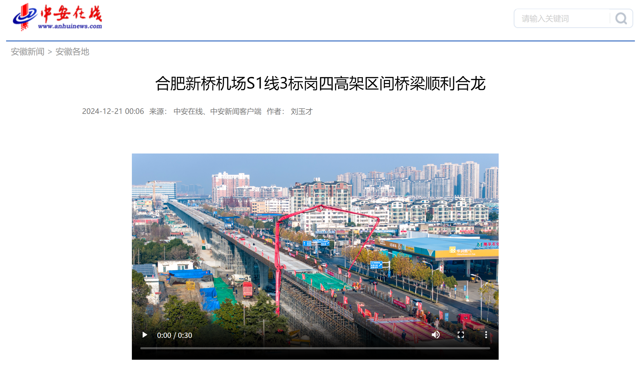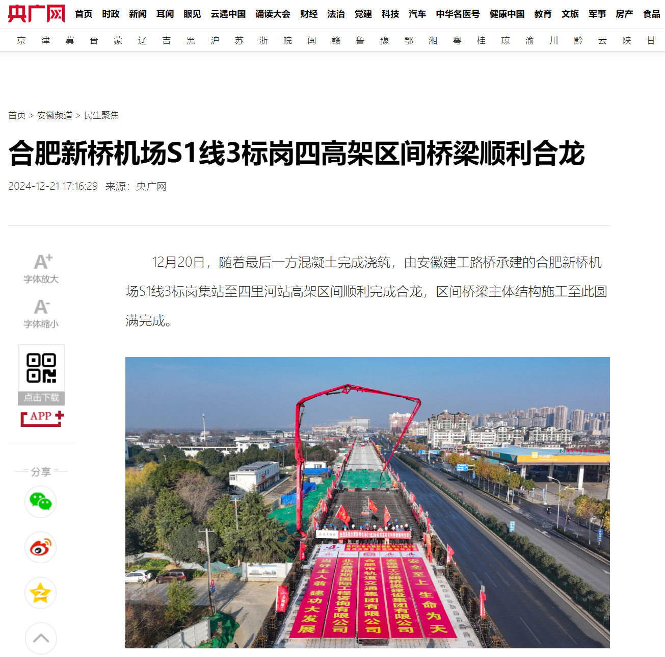【名媒聚焦】央廣網(wǎng)、安徽日報、中安在線等主流媒體聚焦報道合肥新橋機(jī)場S1線3標(biāo)崗四高架區(qū)間橋梁合龍