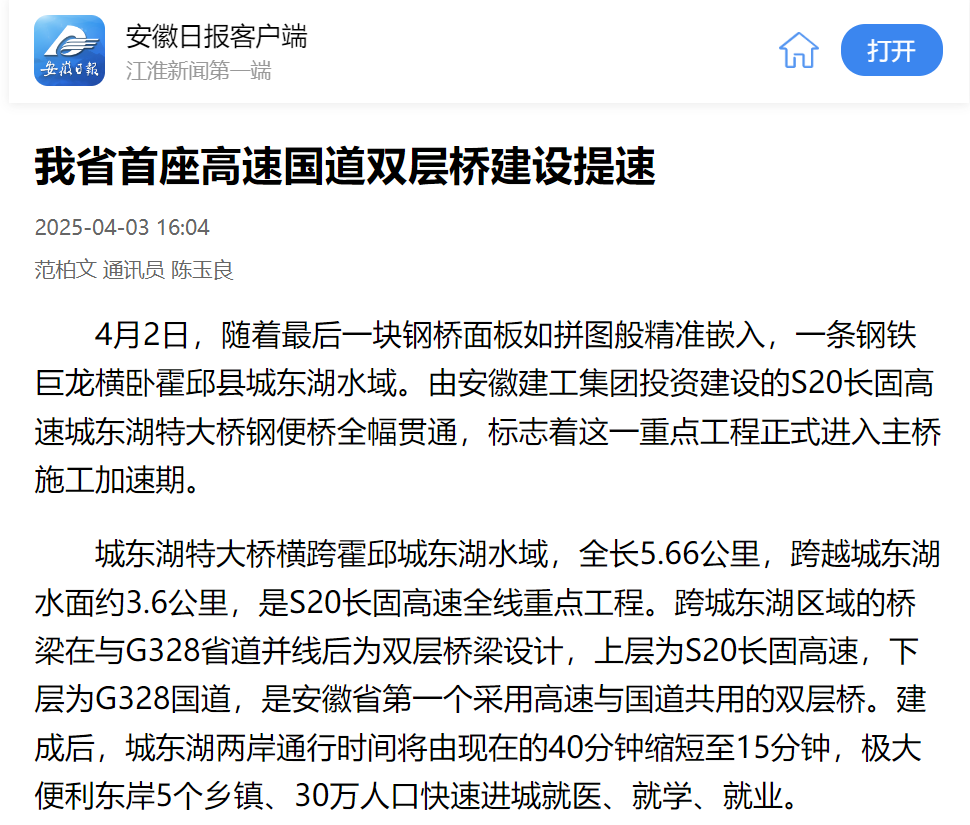 4月2日,隨著最后一塊鋼橋面板精準(zhǔn)嵌入,由安徽建工集團(tuán)投資建設(shè)的S20長(zhǎng)固高速路基01標(biāo)段迎來(lái)重大節(jié)點(diǎn)——城東湖特大橋鋼便橋?qū)崿F(xiàn)全幅貫通,為主橋施工打通了"任督二脈"。