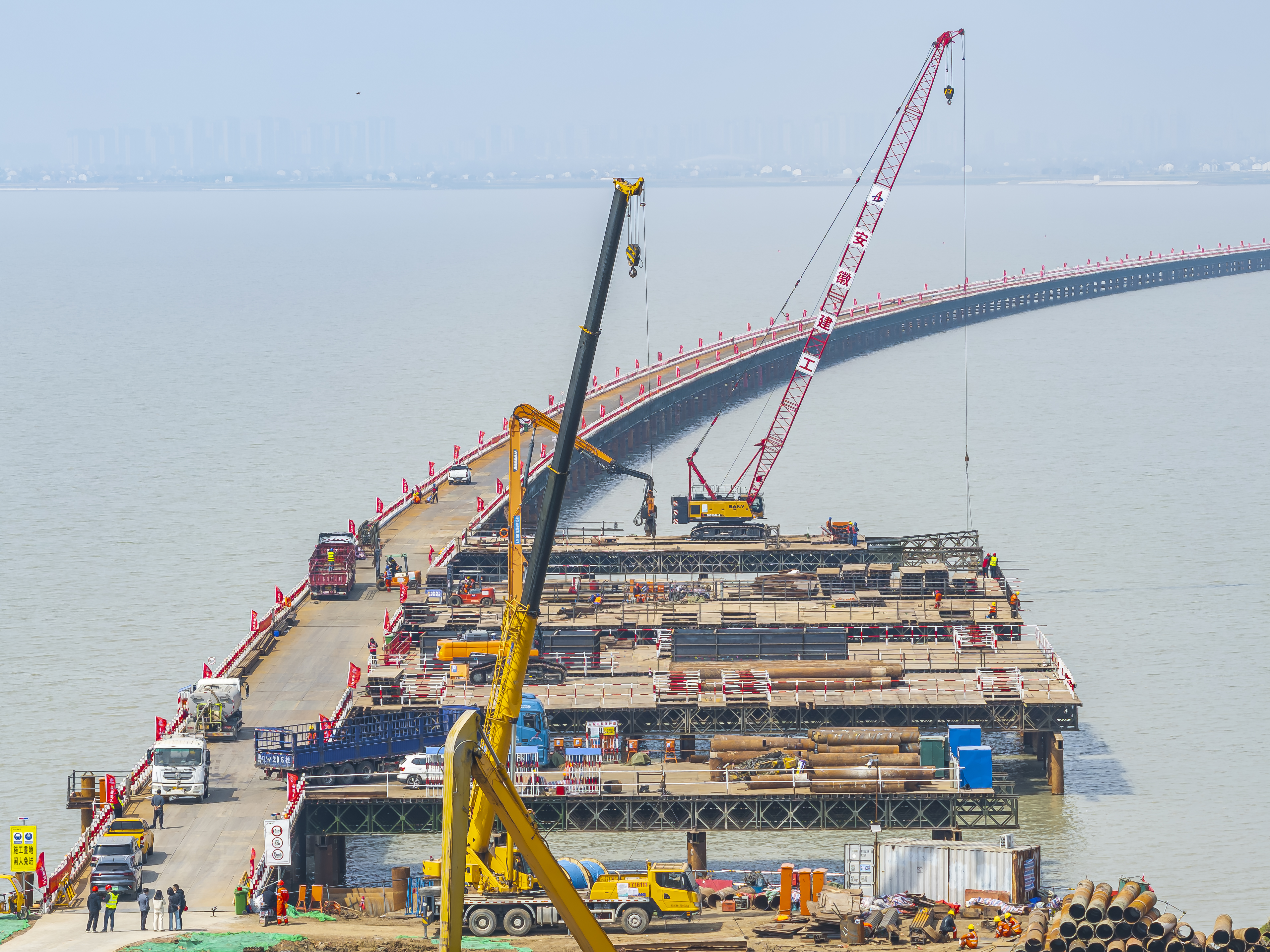 此次貫通的鋼便橋全長(zhǎng)3.5公里,作為主橋施工的“生命線”,承擔(dān)著機(jī)械通行、材料運(yùn)輸?shù)汝P(guān)鍵任務(wù)。為確保鋼便橋順利貫通,項(xiàng)目團(tuán)隊(duì)東西兩岸雙向推進(jìn)、同步攻堅(jiān),科學(xué)調(diào)配人員、物資等要素,歷時(shí)83天順利實(shí)現(xiàn)全幅貫通,較原計(jì)劃提前20天完成任務(wù)。
