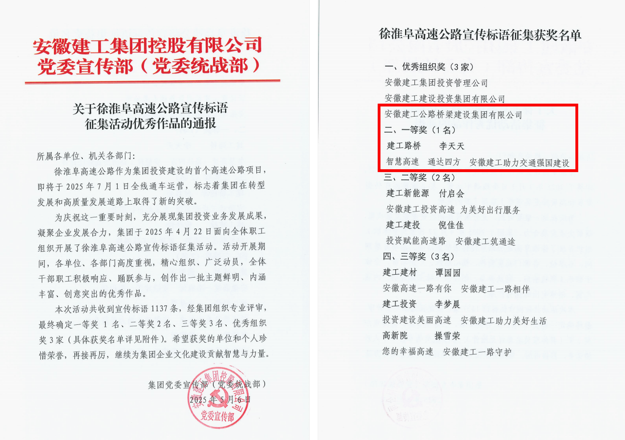 近日,集團徐淮阜高速公路宣傳標語征集活動優(yōu)秀作品結(jié)果公布,公司榮獲優(yōu)秀組織獎,報送作品獲評一等獎。