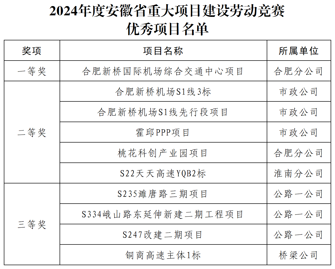 近日,安徽省住建廳與省總工會(huì)對(duì)2024年度重大項(xiàng)目建設(shè)勞動(dòng)競(jìng)賽參賽項(xiàng)目進(jìn)行了通報(bào)表?yè)P(yáng),公司承建的合肥新橋國(guó)際機(jī)場(chǎng)綜合交通中心項(xiàng)目、S1線3標(biāo)等10個(gè)項(xiàng)目榮獲優(yōu)秀項(xiàng)目稱(chēng)號(hào)。