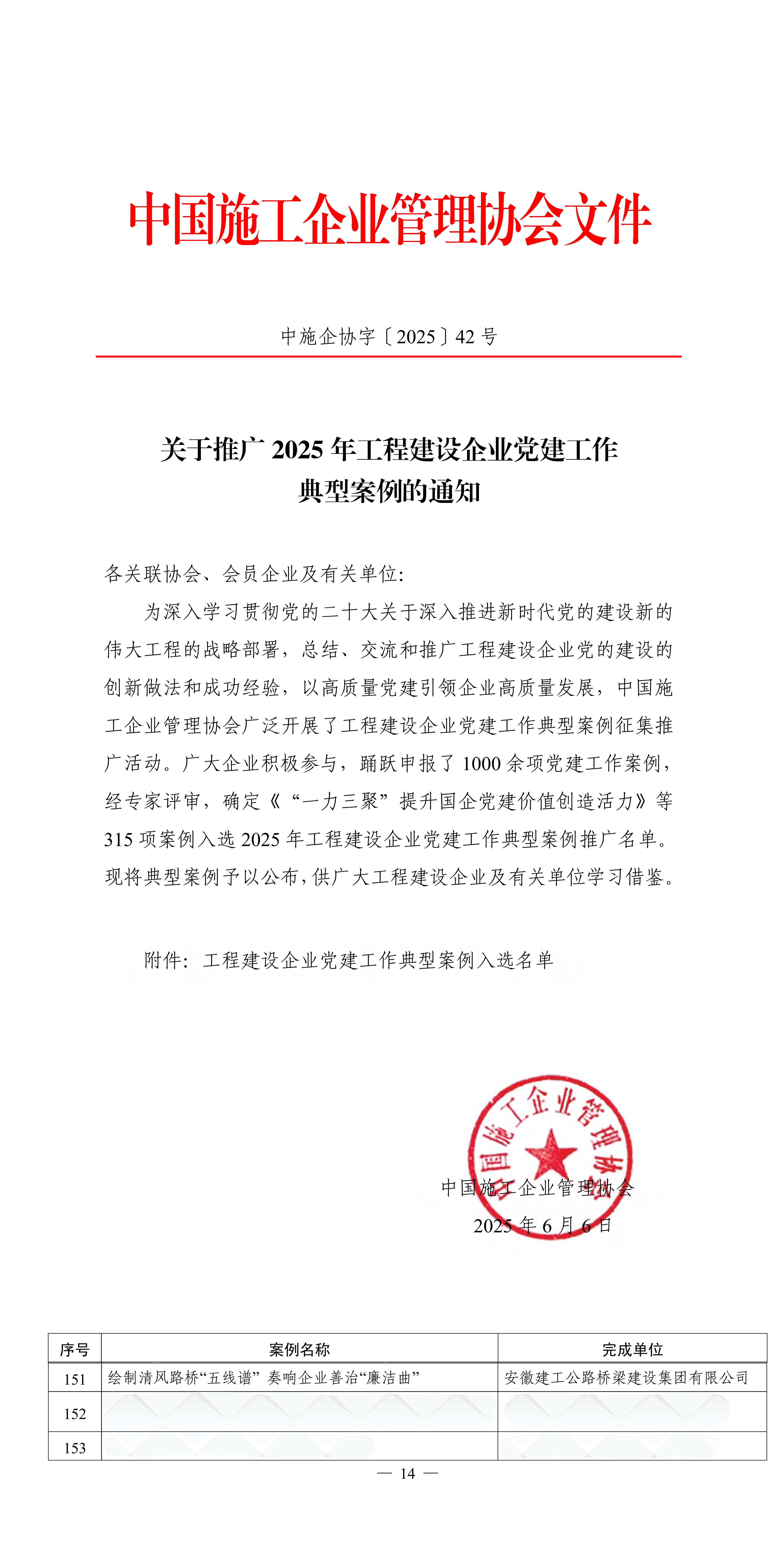近日,中國(guó)施工企業(yè)管理協(xié)會(huì)公布了2025年工程建設(shè)企業(yè)黨建工作典型案例評(píng)選結(jié)果,公司“繪制清風(fēng)路橋‘五線譜’ 奏響企業(yè)善治‘廉潔曲’”廉潔文化案例從全國(guó)1000余項(xiàng)申報(bào)案例中脫穎而出,成功獲評(píng)。