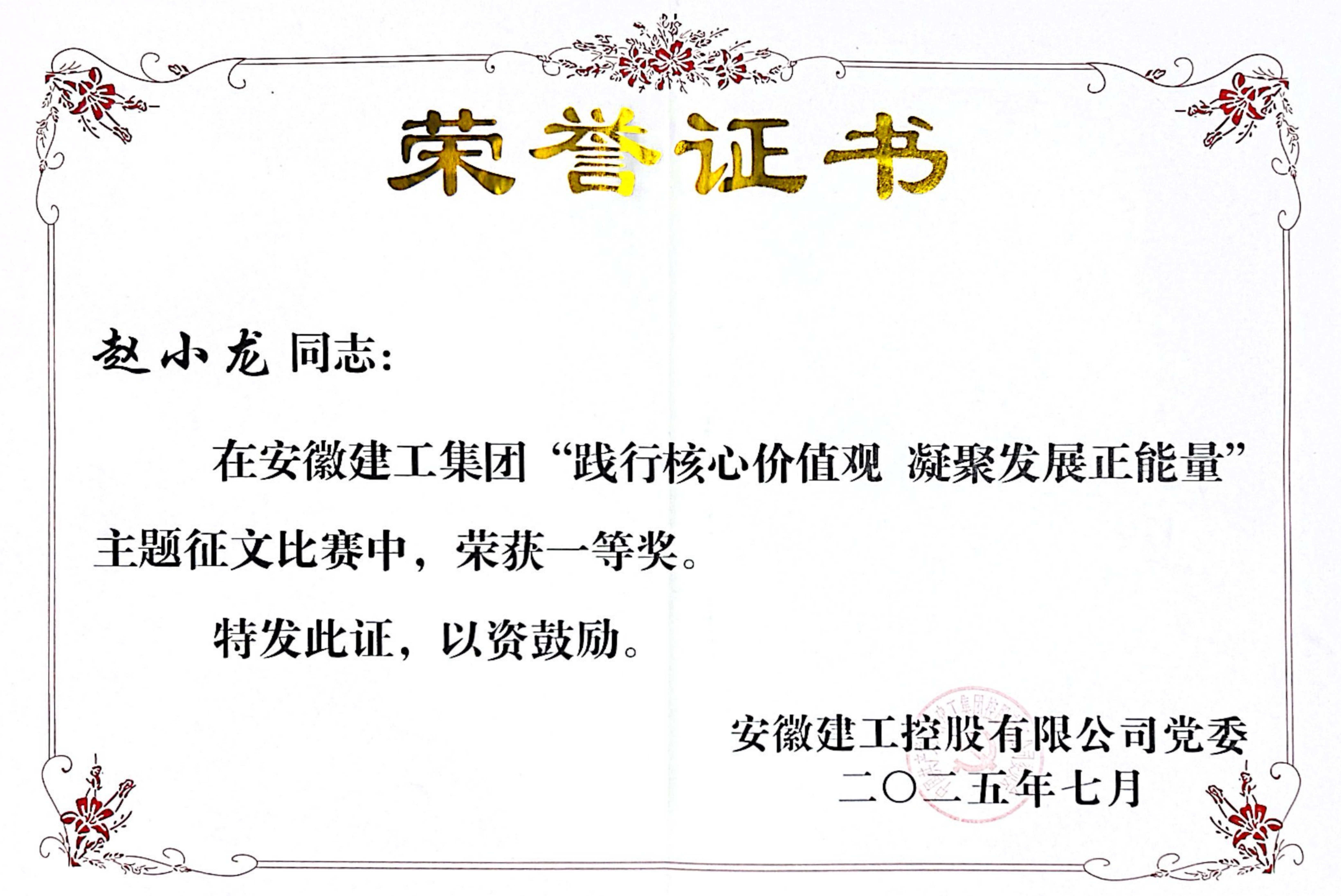 公司在集團(tuán)“踐行核心價(jià)值觀,凝聚發(fā)展正能量”主題征文比賽中榮獲一等獎(jiǎng)