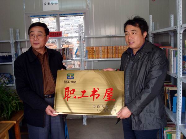 劉主席首先來到項(xiàng)目部職工書屋,察看了書屋的軟硬件設(shè)施及借閱情況,并聽取了項(xiàng)目經(jīng)理江仲明關(guān)于項(xiàng)目施工及職工書屋創(chuàng)建情況的匯報。劉主席對書屋的建設(shè)和管理予以了肯定和贊許,并對書屋更好的發(fā)展提出了希望和要求:一、立足實(shí)際、講求實(shí)效;二、營造氛圍,大力宣傳;三、實(shí)現(xiàn)資源共享,發(fā)揮最大效益;四、總結(jié)經(jīng)驗(yàn)、持續(xù)發(fā)展。邢應(yīng)梅書記還饒有興趣地翻看了圖書借閱登記表,了解職工借閱圖書情況,并對進(jìn)一步完善職工書屋的建設(shè)提出了幾點(diǎn)建議。隨后舉行了簡短的授牌儀式,劉主席向項(xiàng)目經(jīng)理江仲明轉(zhuǎn)授了由安徽省總工會頒發(fā)的“職工書屋”牌匾,并代表集團(tuán)工會向職工書屋贈送了各類書籍300余冊。