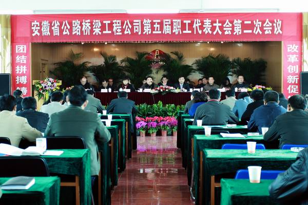 上午8:30,在莊嚴(yán)的國歌聲中,第五屆職工代表大會第二次會議正式開幕。會議由公司黨委委員、副總經(jīng)理、總工程師彭申凱主持。公司總經(jīng)理汪衛(wèi)東在會上作了題為《夯實(shí)管理基礎(chǔ),拓展發(fā)展空間,為推動安徽路橋快速發(fā)展而努力奮進(jìn)》的工作報(bào)告。報(bào)告回顧總結(jié)了2009年工作。2009年是新世紀(jì)以來我國經(jīng)濟(jì)發(fā)展最為困難的一年。公司面對復(fù)雜快變的市場環(huán)境,在集團(tuán)公司的科學(xué)指導(dǎo)下,主動適應(yīng)市場,搶抓機(jī)遇,呈現(xiàn)了平穩(wěn)較快發(fā)展的良好局面,譜寫了實(shí)現(xiàn)新崛起的動人篇章。公司先后榮獲安徽省建筑業(yè)企業(yè)五十強(qiáng)、合肥市委市政府文明單位等市廳級以上集體榮譽(yù)11項(xiàng),形象大幅提升。全年新簽合同額14.7億元,同比增長20%,經(jīng)營業(yè)績再創(chuàng)新高。完成總產(chǎn)值約11.08億元,同比增長10.8%,施工產(chǎn)值再上新臺階。主營業(yè)務(wù)收入8.34億元,實(shí)現(xiàn)利潤總額530.3萬元,同比增長35.22%,資產(chǎn)保值增長率106.5%,經(jīng)濟(jì)效益穩(wěn)步增長。創(chuàng)“黃山杯”、“建工杯”各1項(xiàng),各類科技進(jìn)步獎(jiǎng)(工法)8項(xiàng),創(chuàng)建安全文明示范工地5個(gè),連續(xù)三年無重大安全和質(zhì)量事故。