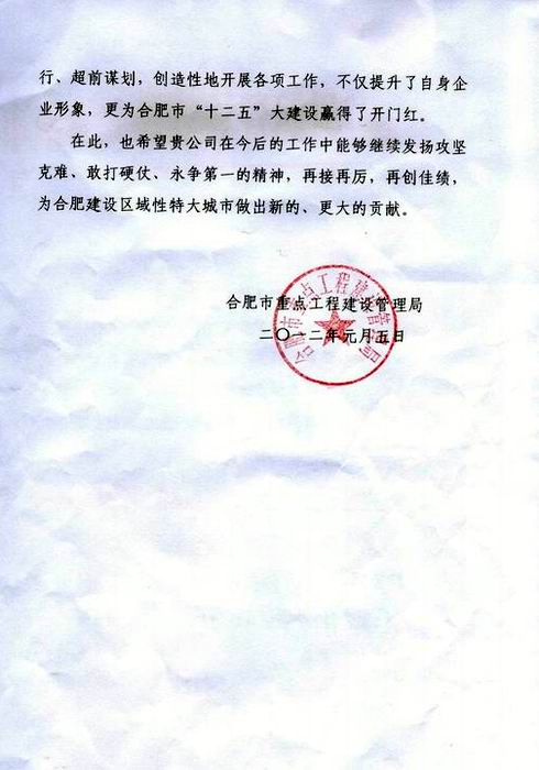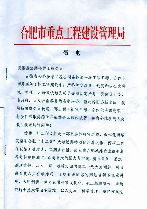 合肥市重點(diǎn)局發(fā)賀電對(duì)公司在市政建設(shè)中的優(yōu)異成績表示祝賀